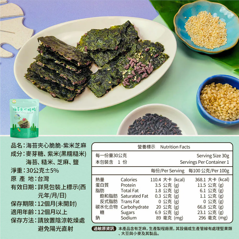 .成分:麥芽糖、紫米(黑糯糙米)、海苔、糙米、芝麻、鹽