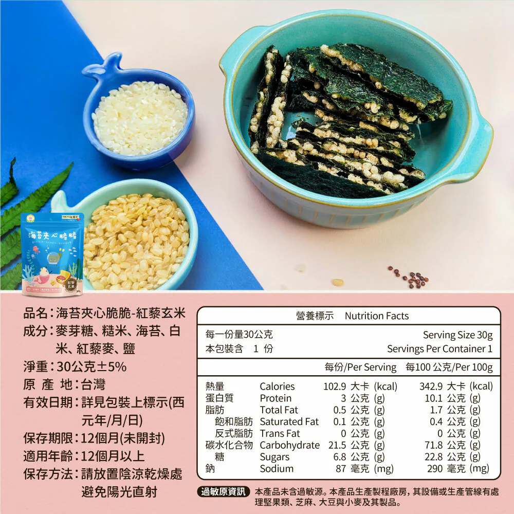 .成分:麥芽糖、糙米、海苔、白米、紅藜麥、鹽