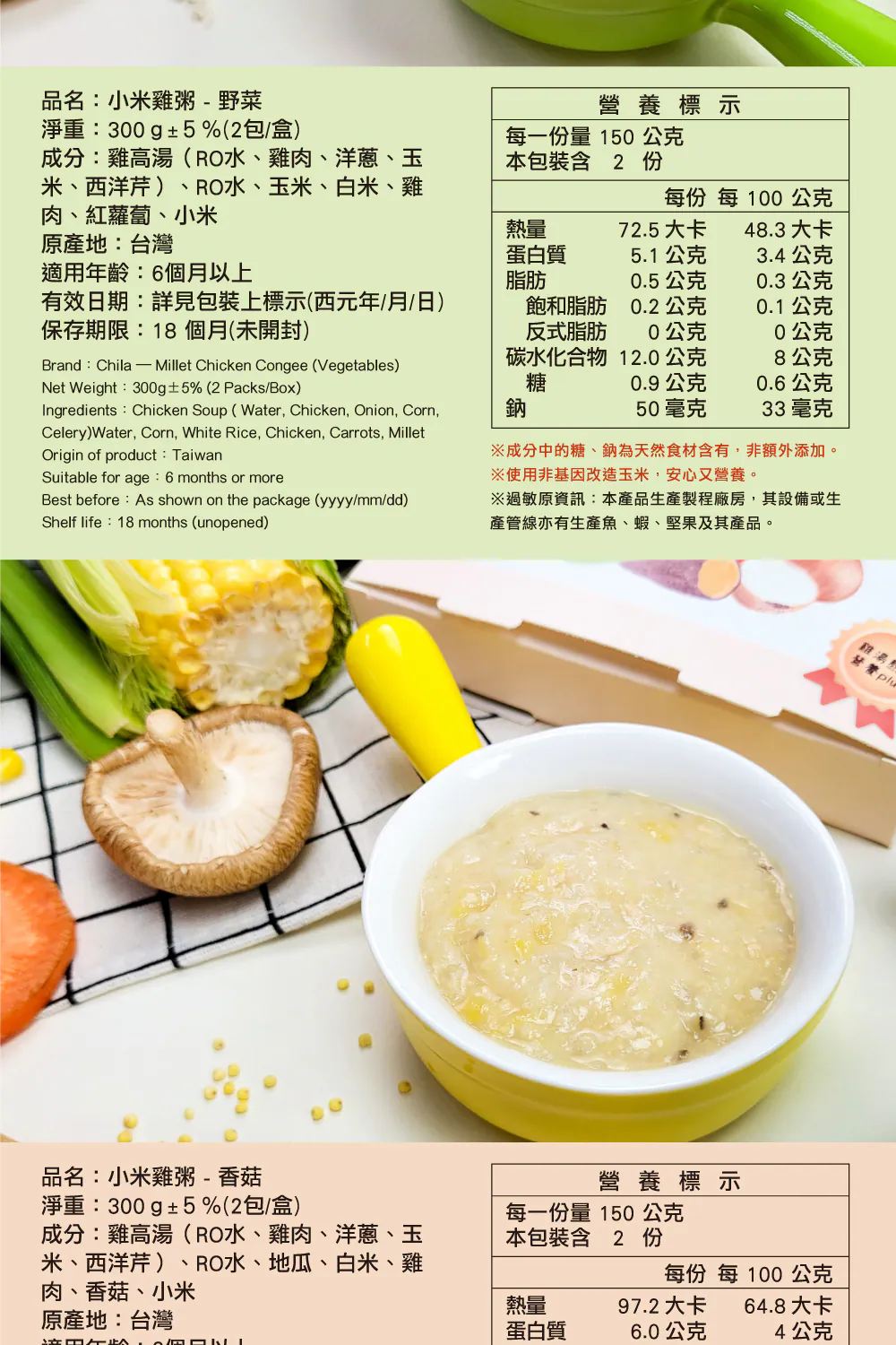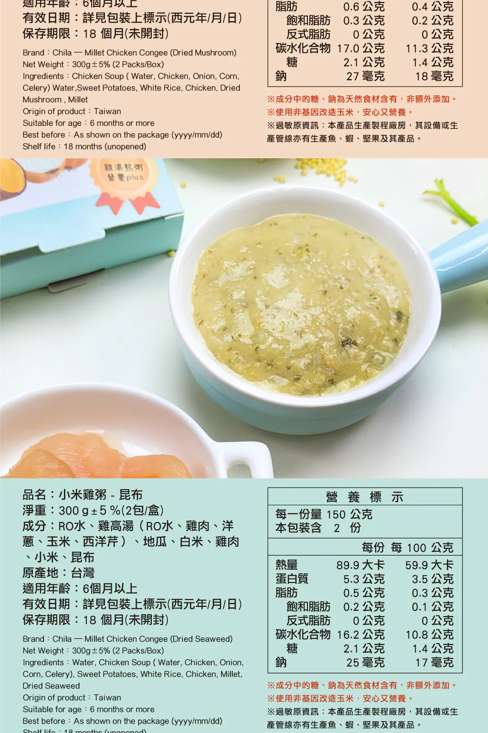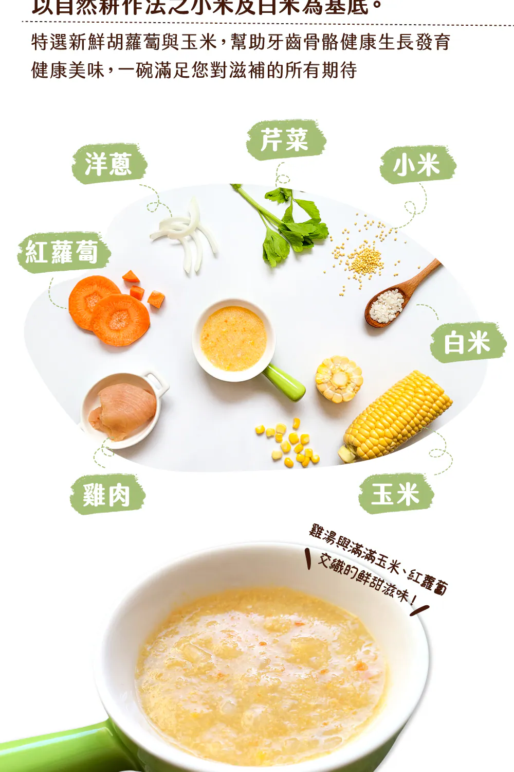 .成分:雞高湯(RO水、雞肉、洋蔥、玉米、西洋芹)、RO水、地瓜、白米、雞肉、香菇、小米