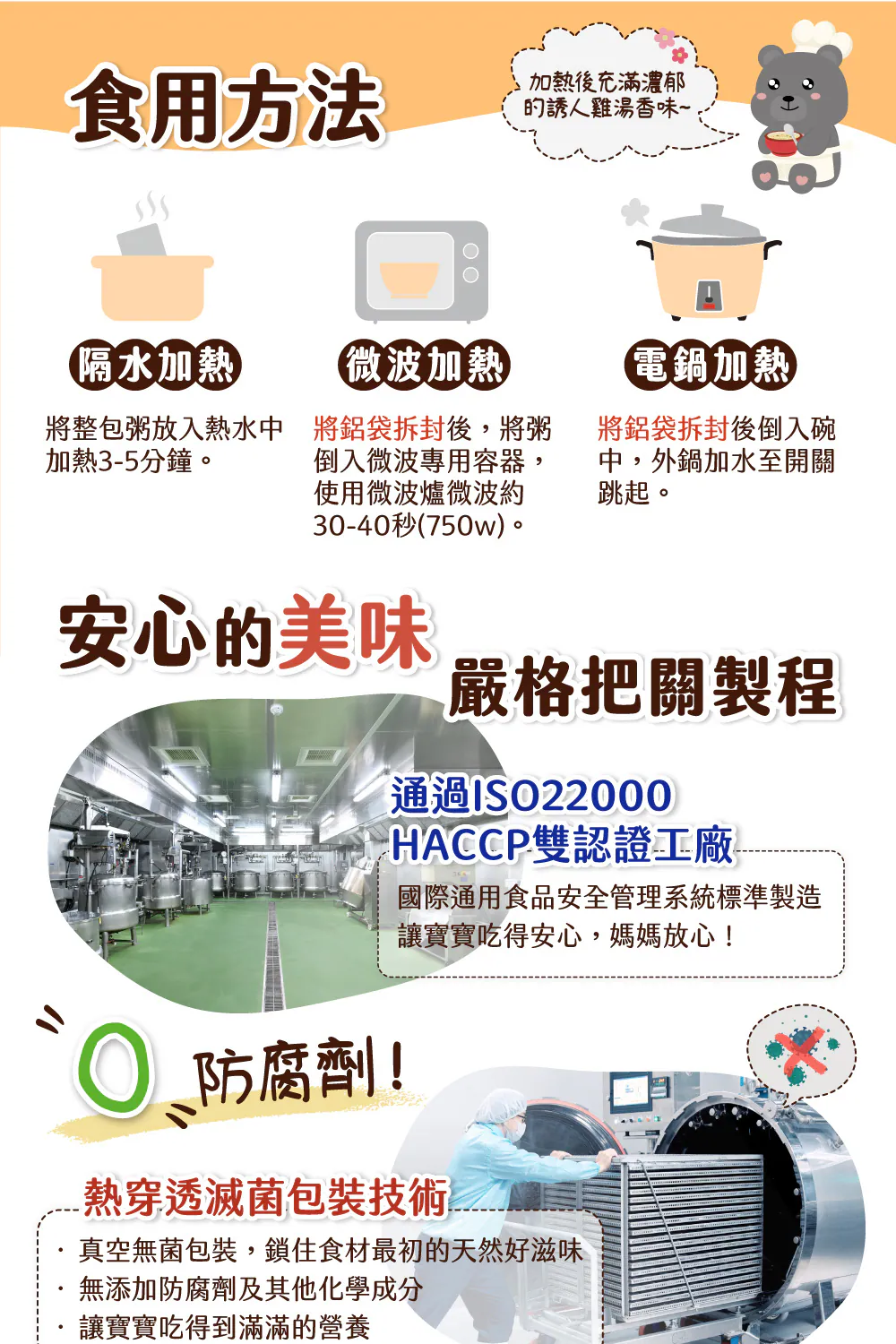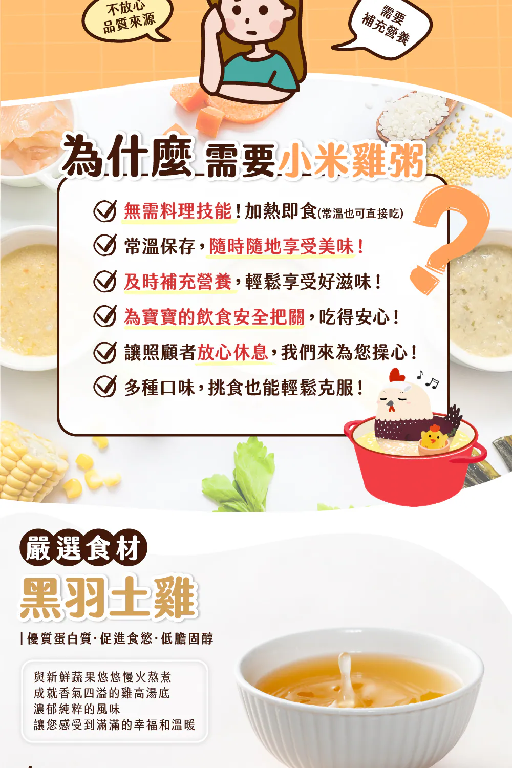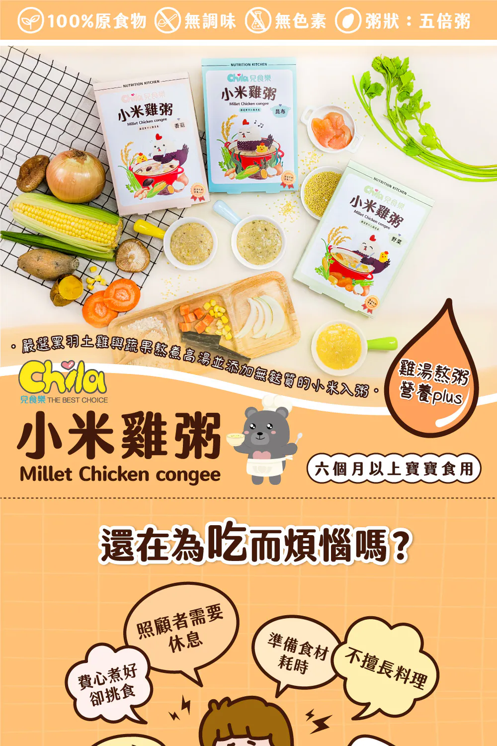 .成分:雞高湯(RO水、雞肉、洋蔥、玉米、西洋芹)、RO水、地瓜、白米、雞肉、香菇、小米