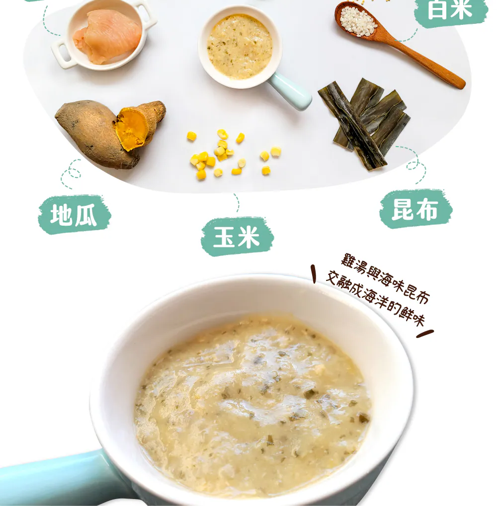 .成分:RO水、雞高湯(RO水、雞肉、洋蔥、玉米、西洋芹)、地瓜、白米、雞肉、小米、昆布