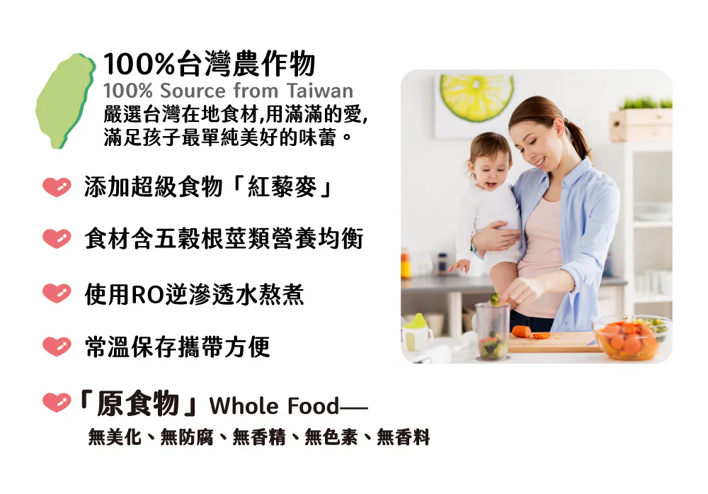 .成分:水、白米、黃甜薯、南瓜、吻仔魚、小松菜、胡蘿蔔、雞肉、紅藜麥