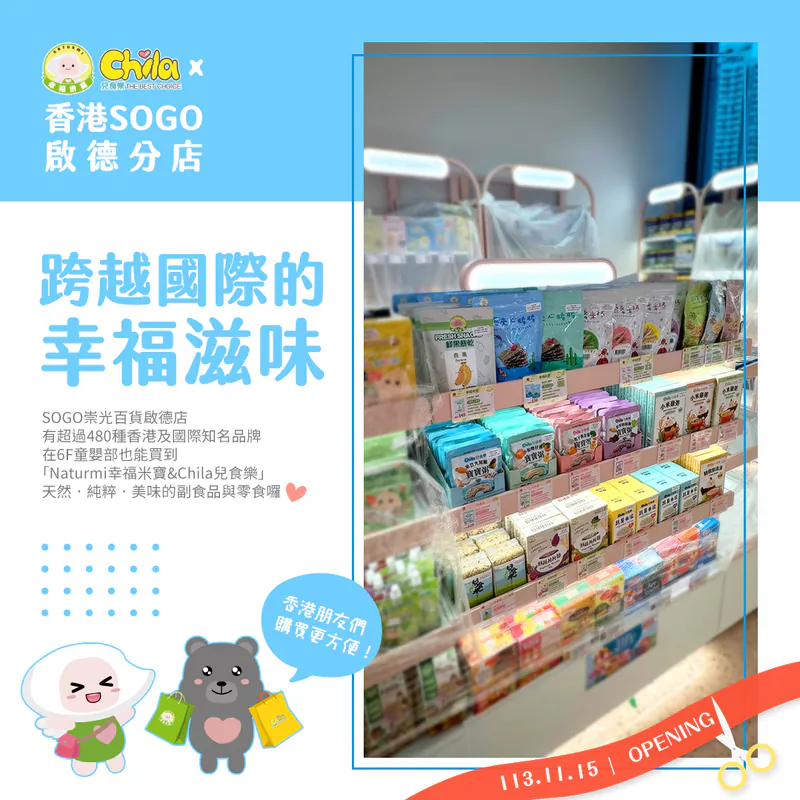 隨著香港爸媽對安全健康的寶寶食品需求日益增加,Naturmi幸福米寶與Chila兒食樂很高興宣布,我們的產品櫃位將於 11月15日 正式進駐 SOGO啟德分店!