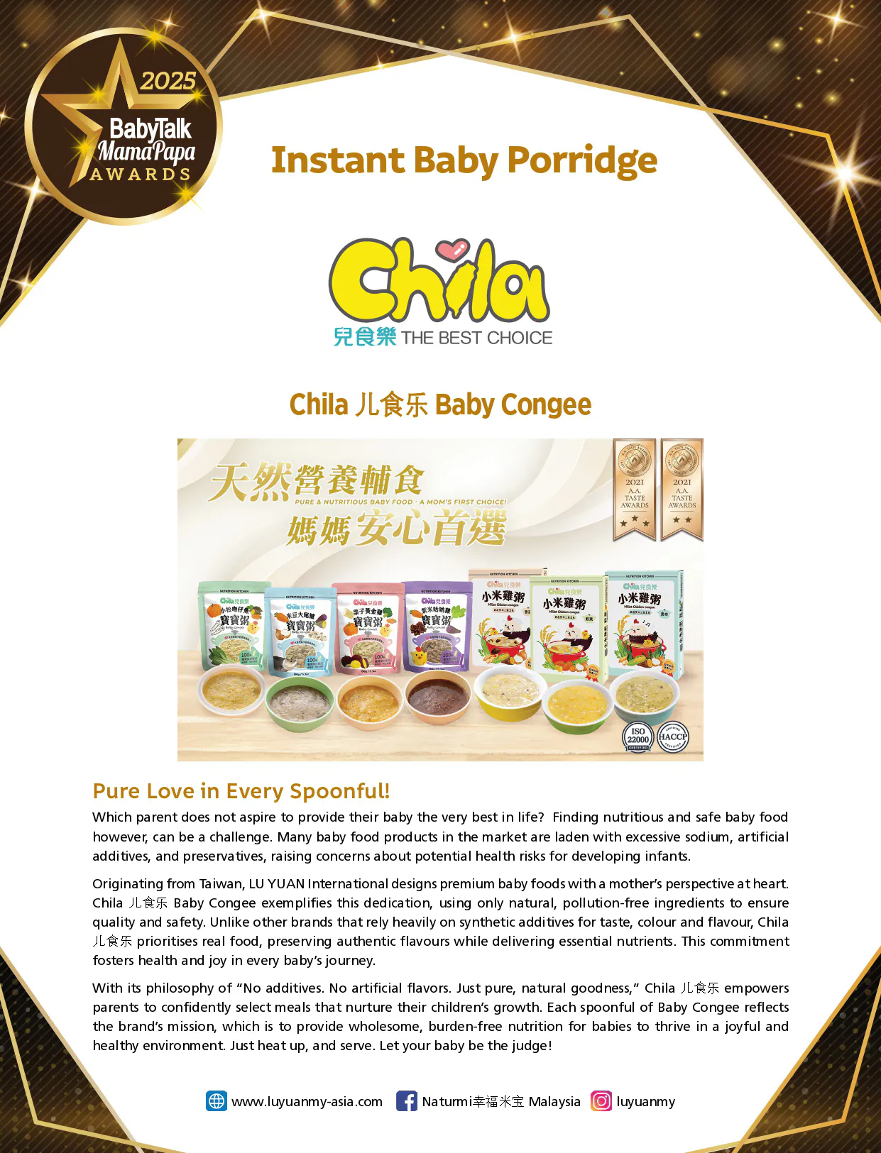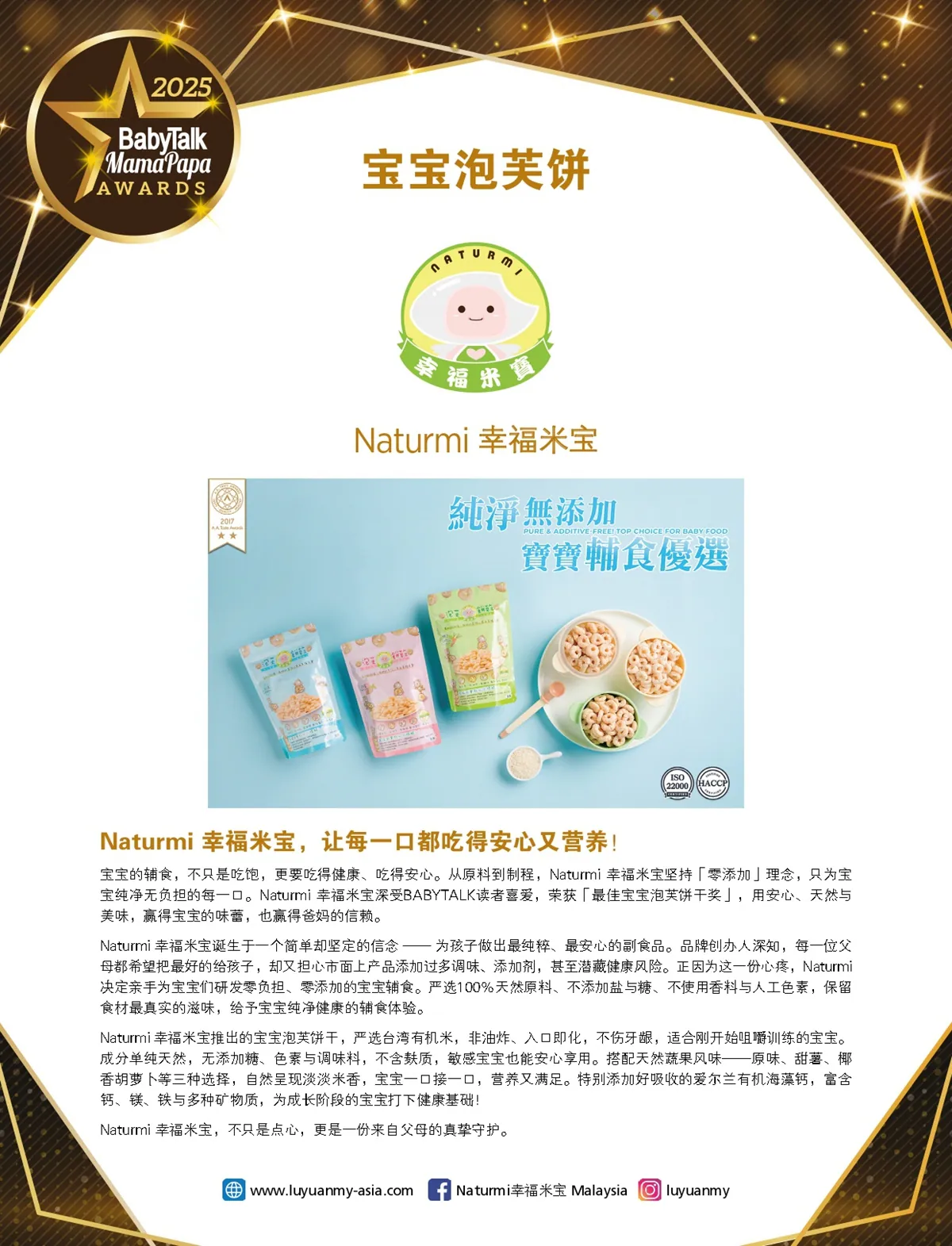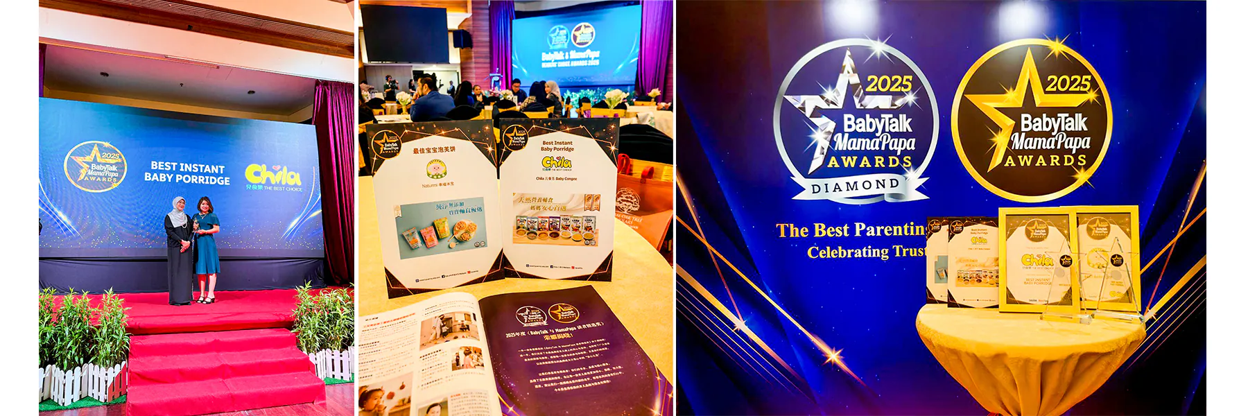 2025 年對 Naturmi幸福米寶 與 Chila兒食樂 來說,是一個值得紀念的里程碑。我們的兩大明星產品 ——泡芙餅乾及寶寶粥系列,分別榮獲馬來西亞知名親子雜誌 BabyTalk & MamaPapa Readers’ Choice Awards 2025「最佳寶寶泡芙餅」「最佳嬰兒即食粥」獎項!
